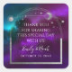 Cosmic Purple Teal Silver Sun Moon Astronomy Wedding Favour Stickers features silver sun, moon and stars with a silver frame on a colourful mystical purple, teal and blue cosmic background. Personalised with a "Thank You" message. Perfect for wedding and party favours. Personalise by editing the text in the text boxes provided. Designed for you by © Evco Studio www.zazzle.com/store/evcostudio