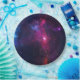 Paper plates with a blue, pink and black fantasy image of cosmic space with stars and wispy nebula.