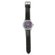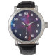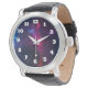 A watch with a blue, pink and black fantasy image of cosmic space with stars and wispy nebula.