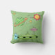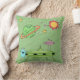 Super cute, whimsical pillow has a green starry background with a blue alien standing next to his green UFO. On top of the UFO, another purple small craft has landed on it. There are constellations and stars in the sky, along with the planet Jupitor and the sun. Reverse side of pillow is green with stars.