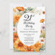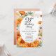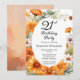Elegant cosmos and marigolds floral design "21st Birthday Party" design featuring a floral frame of marigolds and cosmos flowers in apricot, terracotta and burnt orange on a white background centre panel. Back design features a multi-layered coordinating colours watercolor background