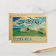 Vintage Costa Rica Save The Date postcards featuring a surfer riding a wave in an aqua turquoise ocean, with puffy blue clouds above. This cool mid-century retro design is the perfect way to gather guests to your Costa Rica destination wedding.