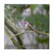 Photo of a Costa's hummingbird sitting on a branch with tree leaves in the background. This hummingbird has a brilliant violet throat (gorget) and crown and is normally seen in the deserts of Arizona and California. However this hummingbird picture was taken in an area of rainforest on the Sunshine Coast of British Columbia, Canada. You can customise this hummingbird photo with your own text and have it printed on many different products.