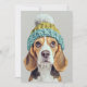 This adorable beagle is all set for the winter with its cute knitted hat featuring shades of green and blue, topped with a fluffy pom-pom. The dog’s expressive eyes and floppy ears make it look even more endearing and ready for the cold season.
