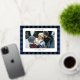 Send warm holiday greetings in style with these luxurious deluxe photo Christmas cards. Showcase your favourite vertical photo against classic Blue and buffalo plaid pattern, framed by a striking real gold foil border. Personalise the modern lettering in the editable text area and make your family name shine in real gold foil! The back of the card offers space for an additional photo and a personalised holiday message. Plus, you can customise the colours to perfectly complement your photo palette, making these cards a truly unique way to celebrate the season.