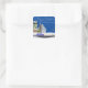 These custom Christmas stickers feature a cosy winter night theme on a dark blue background. An image of a little car is pictured driving past houses in a little village or town on Christmas eve, with a tree on it's roof.