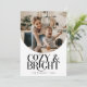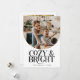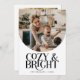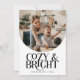 Elegant holiday card featuring a typography text that says "cosy & bright" below your arch shaped photo. Add a second photo on the back along with your message. Background is white.