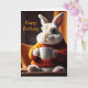 This cute birthday card features a cosy bunny rabbit having its morning coffee.