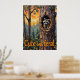 This close-up painting presents a racoon's face and paws emerging from a large, circular bird's nest. The racoon's features are highly detailed, from its whiskers to its fur. The background is a dark, rustic wood with small green leaves. The words "'Cute but feral'" are prominently displayed in a bold, raised yellow font