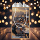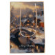 A Christmas holiday gift bag featuring a watercolor illustration of a moonlit village on a snowy night with a flowing river meandering through brightly lit stone cottages and charming stone walking bridges adorned soft glowing lanterns. Merry Christmas greeting displayed on front and back of bag. The greeting can be changed to your preference or removed altogether.