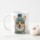 A heartwarming illustration of a cheerful corgi wearing a cosy knitted sweater and a matching blue and green beanie with a pom-pom. The pup’s bright eyes and joyful expression make this image perfect for winter vibes and pet lovers.