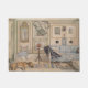 This image features an artwork by Swedish painter Carl Larsson (1853–1919), who was a member of the Arts and Crafts movement. The image shows an elegant domestic scene in a stylish living room; a dog is sleeping calmly on the rug, beside a blue-and-white striped sofa. The original painting was completed in 1894.