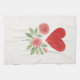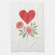This kitchen towel is designed to enhance a kitchen decorated for Valentine's Day. The cosy cottage artwork will appeal to modern, minimalist women. Embracing the principle of "less is more," this towel is ideal for those who appreciate understated beauty. The watercolor illustration features a red heart, complemented by two pink roses with stems and leaves. The background is a creamy shade of white.