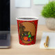 This Thanksgiving Holiday Cup featuring a country-style design of pale olive green and red plaid background behind a stained glass look wicker cornucopia filled w/ harvest fresh fruits and vegetables, and double outer borders (red plaid and solid black). See coordinating products by digital artist, Leslie Sigal Javorek, at HoMeArts.