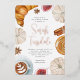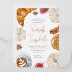 Invite guests for an elegant autumn or fall bridal shower brunch with these beautiful watercolor invitations. Design features your celebration details in modern lettering, surrounded by illustrations of breakfast pastries, croissants, coffee, figs, white pumpkins, cinnamon and anise in warm earth tones with rose gold foil accents and lettering.