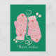 A pair of pink mittens adorned with intricate mandala patterns rests against a vibrant green background. Each mitten features heart accents and is connected by a whimsical string with fluffy pom-poms, exuding festive warmth and cheerful wishes.