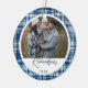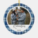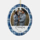 Navy & baby blue plaid fabric 2 photo family ornament. The design features a faux navy and baby blue plaid fabric texture design with hints of light blue. Personalise with two special photos, one on each side, and customise with your last name and year. Designed by Moodthology Papery