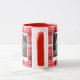 Red & white plaid fabric 3 photo family mug. The design features a faux red and white plaid flannel fabric texture design with hints of light pink. Personalise with three special photos, and customise with your name(s). Designed by Moodthology Papery