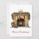 A flat holiday card with a warm and cosy illustration featuring an old fashioned fireplace. Stocking hanging with care. Garland hanging over the mantel. A warm roaring fire in the hearth.