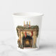 Paper cups with a warm and cosy illustration featuring an old fashioned fireplace. Stocking hanging with care. Garland hanging over the mantel. A warm roaring fire in the hearth.