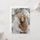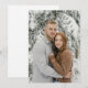This wedding invitation features a cosy winter scene with a couple embracing in a snowy forest. The design showcases a naturalistic photographic style, capturing the warmth and intimacy of the moment against a backdrop of snow-covered evergreens. The colour palette is dominated by cool whites and greys, complemented by earthy tones from the subjects' clothing, creating a serene and affectionate mood. Perfect for couples who love the beauty of nature and the tranquillity of winter, this invitation sets the tone for a heartfelt celebration.