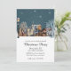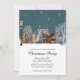 This custom holiday or Christmas party invitation features a cosy watercolor style illustration. An image of a little winter village at night is printed across the centre portion. A glowing lamppost is pictured on the left, and falling snow gently covers the houses in the town.
