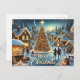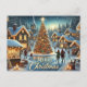 The postcard features a cosy winter scene in a small village. Snow blankets the ground and rooftops of charming, old-fashioned houses adorned with twinkling Christmas lights. In the centre, a large Christmas tree stands decorated with colourful ornaments and a shining star on top. People in warm winter clothing are ice skating on a frozen pond, while others are gathered around a wooden stall serving hot cocoa. The sky is a deep, twilight blue with gentle snowflakes falling, adding to the festive atmosphere. In the foreground, "Merry Christmas" is written in an elegant, golden script with a subtle glow, adding warmth to the chilly scene.