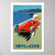 Vintage travel poster for the Cote d'Azur ( French Riviera) in southern France showing a race car speeding along.