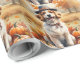 A watercolor-style painting of a cheerful dog sitting amidst a pile of vibrant fall leaves, surrounded by tiny pumpkins and scattered acorns. The dog wears a little pilgrim hat and beams with joy, capturing the spirit of Thanksgiving. In the background, soft harvest fields and golden-hued trees create a peaceful countryside ambiance. Gentle textures and warm, muted autumn tones give the scene a cosy, nostalgic feel perfect for celebrating the beauty of the season.