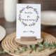 A wedding table number card showcasing a watercolor floral spray in purple and green for the reception tables. A wonderful addition to a cottage garden themed ceremony. On the reverse side is wreath of leaves in purple and green with the text - Thank You for Sharing Our Day!