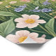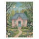 This whimsical artwork portrays a charming pink cottage nestled in the heart of a lush, enchanting forest. The cottage, with its slate-blue roof and inviting teal door, is surrounded by a profusion of colorful wildflowers in a soft, spring-like palette. A winding stone path leads the viewer to the front door, while the scene is framed by the embracing branches of two large, stylized trees. The sky is a serene teal with a gentle full moon and light clouds, adding to the magical, storybook atmosphere. This piece evokes a feeling of peace, nostalgia, and rustic charm.