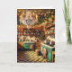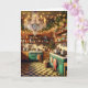 Wishing you a warm and cosy old-fashioned Christmas and a Happy New Year. inside text of card can be personalised, so you can add your name if you want or change the greeting. Cute old-fashioned retro pink, teal with black and white tiled floors kitchen with chandelier, room full of holiday decorations, holiday wreaths and Christmas lights.