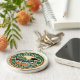 Circular badge with a central illustration of a waterfowl floating on stylized blue and cream waves. The bird features a dark head, a pointed beak, and a distinct white checkered pattern on its back. The background consists of green pine tree silhouettes against a pale sky. The design is framed by a scalloped border in orange and green, featuring small white stars. Arched text at the top and bottom is rendered in a clean, sans-serif cream font.