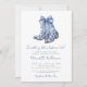 Something Blue Before I Do! Elegant Cowboy Boot Bridal Shower Invitation. Celebrate the bride-to-be with a touch of country charm and sophistication. This invitation features a pair of fancy blue cowboy boots at the top, adorned with a large watercolor bow. The boots are decorated with a floral or chinoiserie-inspired pattern, adding an elegant twist to the rustic theme. The phrase "Something blue before I do!" is written in a stylish mix of dark blue and grey fonts, combining handwritten script and classic serif typography for a polished, modern feel.