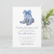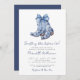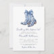 Something Blue Before I Do! Elegant Cowboy Boot Bridal Shower Invitation. Celebrate the bride-to-be with a touch of country charm and sophistication. This invitation features a pair of fancy blue cowboy boots at the top, adorned with a large watercolor bow. The boots are decorated with a floral or chinoiserie-inspired pattern, adding an elegant twist to the rustic theme. The phrase "Something blue before I do!" is written in a stylish mix of navy blue and grey fonts, combining handwritten script and classic serif typography for a polished, modern feel.