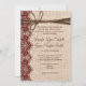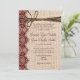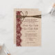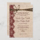 This rustic wedding invitation is perfect for any country western wedding. It features a rustic country printed burlap background on both sides of the invitation. The invitation has a printed maroon red lace embellishment on the side. The top has a printed twine embellishment. The burlap, lace, and twine are just printed designs. It is not actual burlap fabric or actual lace or twine.