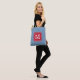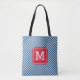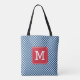 Stylish monogrammed all-over-print tote bag featuring featuring a country chic blue gingham pattern.