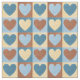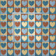 This is a cute fabric design for curtains, household use, or clothing. It features a pattern of pale yellow, light blue, cinnamon brown, and dark blue hearts on contrasting colour squares. Perfect for a country chic or homespun, comfy look.