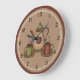 This fun country & primitive style clock will look wonderful in your kitchen! Pictured are two coffee cups and a coffee pot. One coffee cup is green gingham check and the other is a red polka dots. Coffee pot is tan with a red apple and green and tan accents.