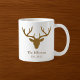A lovely country decor for your kitchen, this coffee mug features deer head silhouette in brown. Underneath is a template for your family name and another for the date it was established.