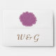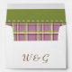 Bring touch of country charm to your event with custom envelopes featuring a wisteria purple rose with a stitch-like border on the front at the bottom right, a matching purple rose on the back flap, and initials that you can change to match your own on the back underneath. A final dash of cosy allure can be found on the inside with a wisteria, sage green, buttermilk beige, and coffee plaid pattern covering the interior with a green accent panel that appears to be stitched on at the top on the flap, giving a wonderful homemade touch to frame your invitation. Be sure to check out the full Country Garden Wedding collection to find more products, including invitations, guest books, return address labels, and even favour boxes, with matching designs that will allow for a truly coordinated wedding or special event.