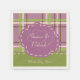 A plaid background in shades of wisteria purple, sage green, buttermilk beige, and coffee brown, is decorated with an accent panel in green and a rose with sample names and a date that you can customise for your special event. Both the rose and accent panel have a stitched on appearance to add a bit of homemade charm to the design. These napkins add a soft and pretty flair to any country garden themed wedding reception or rehearsal dinner.