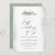If you are planning on celebrating your wedding outdoors or simply love greenery and mountains, this wedding invitation will be just perfect for you! Featuring green watercolor leaves around a chic script font, a mountain and log cabin illustration at the top with trees. Your wedding details are displayed in classy serif typography placed on top of a faded watercolor background. Reversing to a darker green watercolor. Perfect for rustic or country themed weddings.