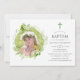 Wild woodland forest baptism, christening or dedication invitation featuring ferns, wildflowers and strawberries and a sage green watercolor wash background. A portrait shaped photo is recommended. A square shaped photo is recommended.