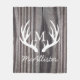 Rustic elegant country fleece blanket featuring white deer antlers silhouette in the centre. There is a large white monogram letter between the antlers and also your family's name underneath! Background is a nice weathered grey wood background.