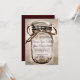 Rustic Mason Jar Country Wedding Invitations with a sepia tinted mason jar on a distressed background. The mason jar has a bow tied around it. The back of the invitation is dark brown with the word "Love" is white script in the centre. These distressed wedding invitations are great for any country style wedding including rustic weddings, barn weddings, and any weddings using mason jars in the wedding reception decor.