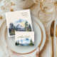 Wedding place card with watercolor landscape of mountains, blue sky and majestic pine trees in the foreground. Design has cream and olive green colour palette with a line on which you can handwrite your guest's name. Browse my Country Lake Wedding collection for co-ordinating invitations, stationery, signs and wedding décor. Message me if you need me to add any additional templates.