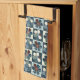 Cute kitchen towel country pattern features a 4-panel repeating graphic of patchwork button flowers in shades of blue with complementary colours.
