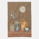 Country kitchen farmhouse towel features an aged wood countertop, lots of kitchen utensils and cookware, a wooden cutting board, spice cabinet, baby's breath flowers in a pitcher and a vintage clock on the wall. A coordinating apron, pot holder and oven mitt, as well as another versison of the towel are available in our shop too.
