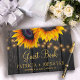 Rustic country vintage traditional style personalised guest book with big yellow gold sunflowers and strings of twinkle lights on a dark brown barn wood background and with elegant gold typography script. Ideal for summer or autumn fall | elegant rustic country | outdoor garden backyard themed weddings.